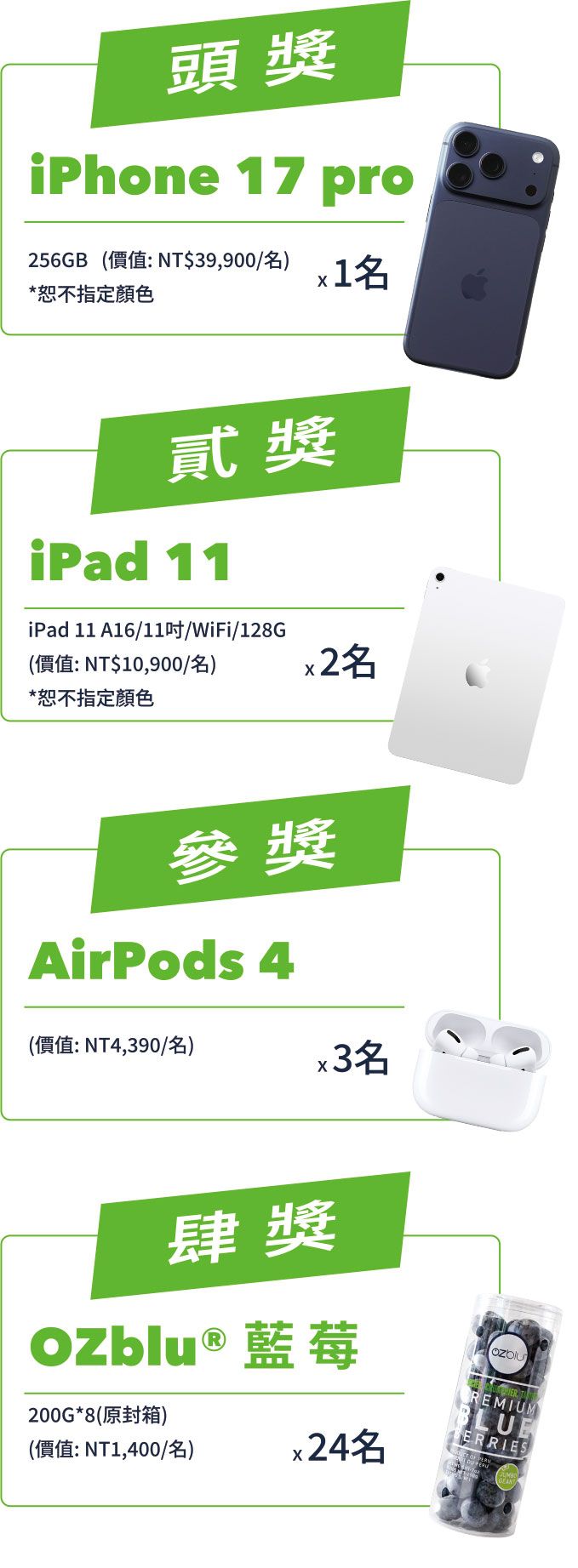 於活動時間內(2025/11/24-2026/01/31)至指定通路購買OZblu®祕魯藍莓1管,即可參加抽獎活動!。