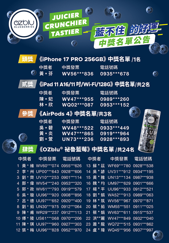 1.中獎名單於2026/2/5(四)公布於台鮮有限公司官方臉書,中獎者可至中獎公布頁面自行下載中獎通知書,並於2026/2/12(四)前將中獎通知書、身分證正反面影本掛號郵寄至(104)台北市士林區中山北路5段620號3F 伽立略「藍莓活動小組」收(郵戳為憑),以便核對中獎資格。逾期寄回中獎通知信函,視同放棄中獎資格。
